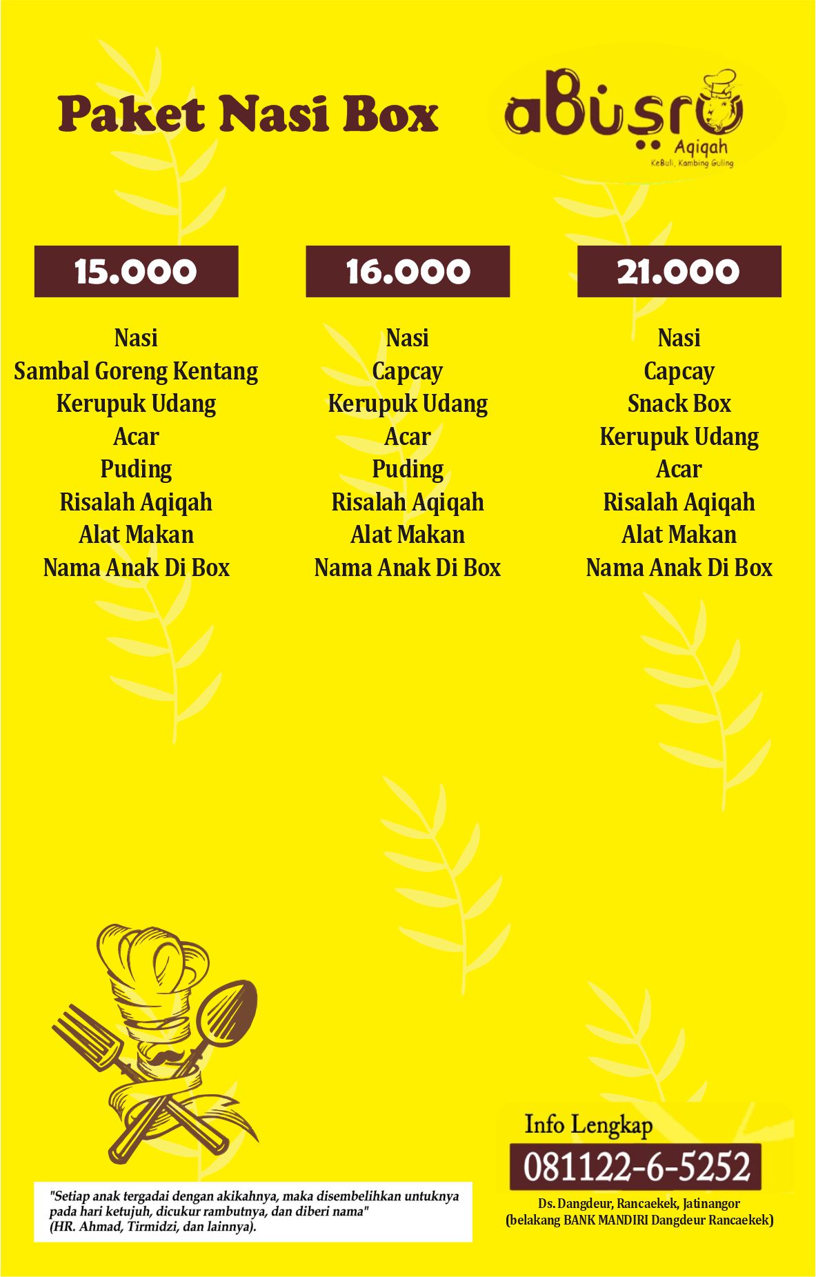 Rayakan aqiqah buah hati tanpa ribet. Abusro Aqiqah siap melayani dengan menu berkualitas, pelayanan terpercaya, dan pengantaran tepat waktu untuk seluruh area Bandung, Sumedang, dan sekitarnya.